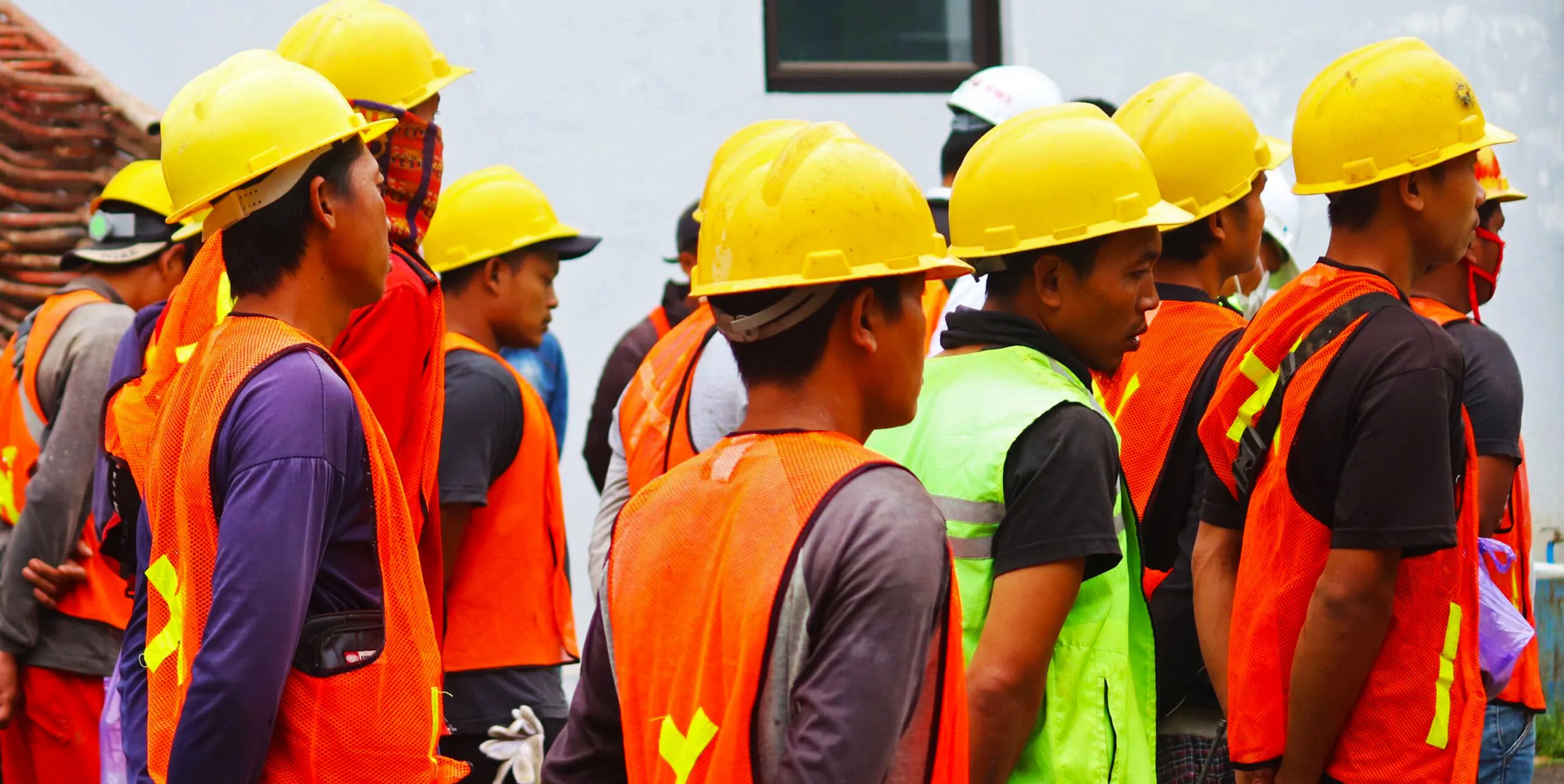 Gambar: Pemandangan lokasi proyek dengan beberapa pekerja konstruksi memakai helm, rompi reflektif, dan APD lainnya di tengah struktur rangka baja dan scaffolding.
