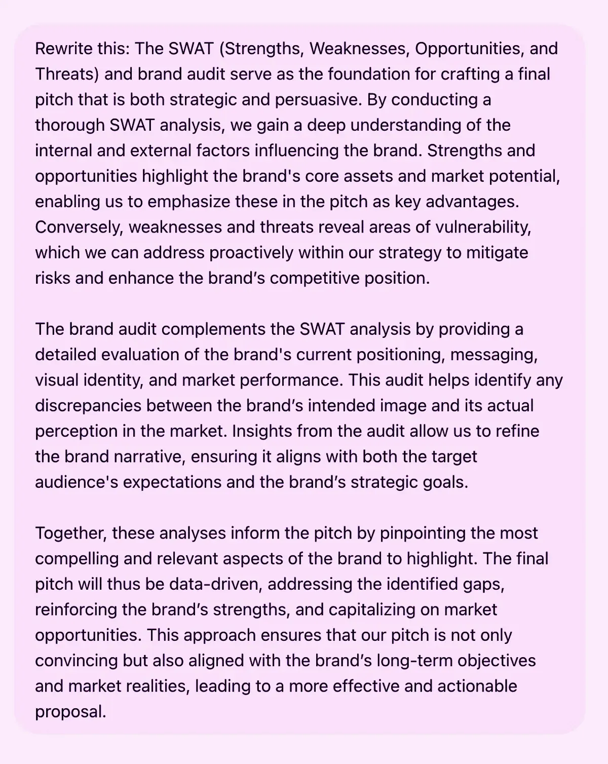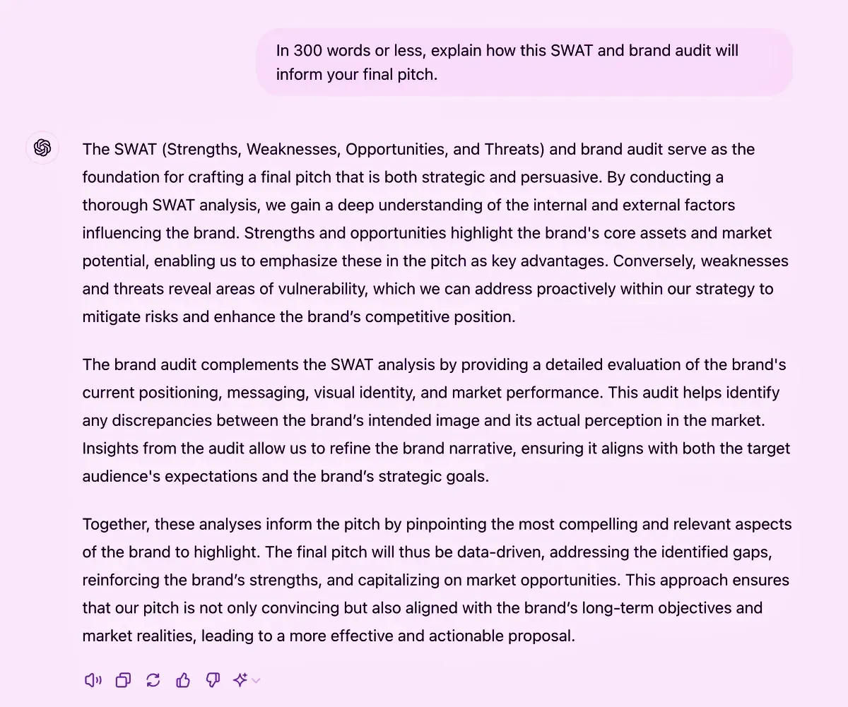 “In 300 words or fewer, explain how this SWAT and brand audit will inform your final pitch.”