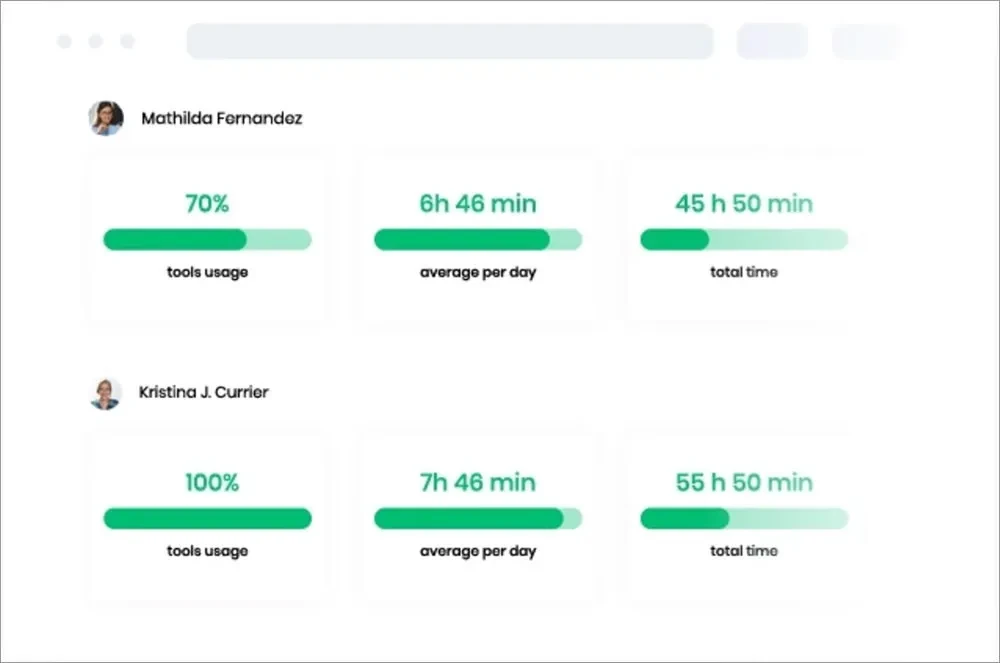 Selain melacak waktu, Anda juga dapat melihat proses kerja setiap karyawan melalui tangkapan layar dan pelacakan aktivitas. Laporan terperinci menunjukkan aplikasi dan situs web yang dikunjungi oleh karyawan selama bekerja, sementara pelacakan produktivitas membantu Anda mengukur produktivitas berdasarkan penggunaan aplikasi & web.